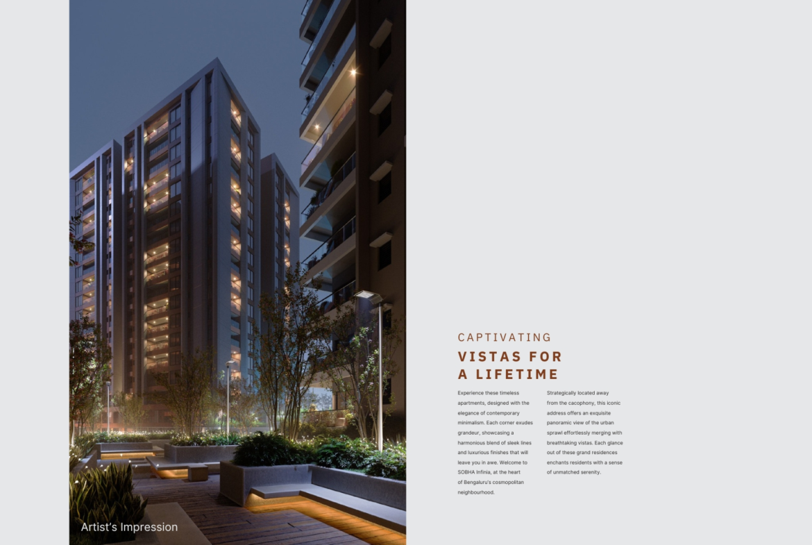 A timeless address at Sarjapur-Marathahalli Road, Bengaluru, Sobha Infinia offers luxury apartments crafted with meticulous attention to detail. These iconic residences blend modern sophistication with expansive views of the cosmopolitan city. Designed for the discerning elite, Sobha Infinia epitomizes exclusivity, offering premium amenities, serene landscapes, and impeccable connectivity to major business hubs, schools, and hospitals.